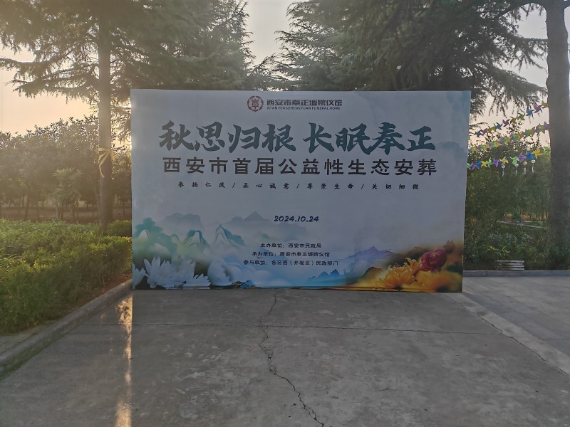 10月24日,西安首届公益性生态安葬活动在奉正塬殡仪馆公墓广场庄重举行。苍松翠柏间,60位逝者回归自然,生命之美在绿水青山间延续。鸣钟九响、敬献果品、秉烛燃香、净水三杯、敬献花篮、祭文追思、鞠躬致礼、放生祈福。简单而又庄重的祭祀仪式后,逝者家属们亲手将装有亲人骨灰的可降解骨灰盒安放在墓穴内,撒放草种花瓣,让亲人在花香中“入土为安”,完成“融身大地、回归自然”的心愿,从此与苍郁绿树相依,与绚烂鲜花共荣。